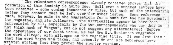 ~ Before the appearance of the first issue, Mr and Mrs G. A. Henderson suggested the name Allvega, with Allvegan as the magazine title. It was from this that the word Vegan was taken,?? ~ ? more