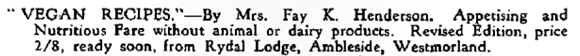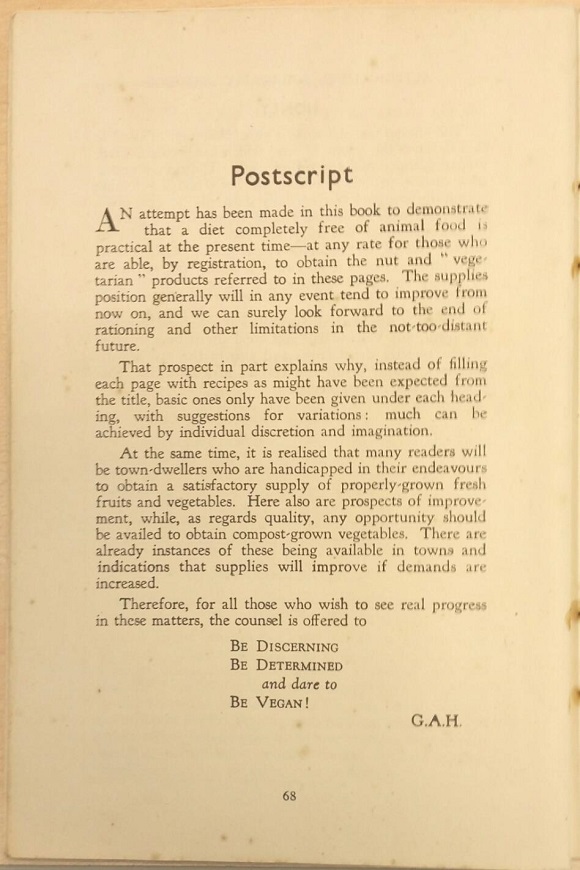 By 1945 Fay and Allan were thinking that it was high-time for a vegan recipe book, to make it easier for folk to live & eat as vegans. So, Fay started work on testing recipes and on writing. We imagine that Allan also contributed a great deal to the project.